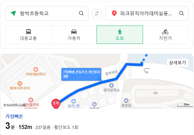 함박초등학교→ 직진 3m→ 오른쪽 방향 24m→ 펠메쉬카에서 오른쪽 방향 98m→ 파크뮤직아카데미실용음악학원 도착! 2층으로~