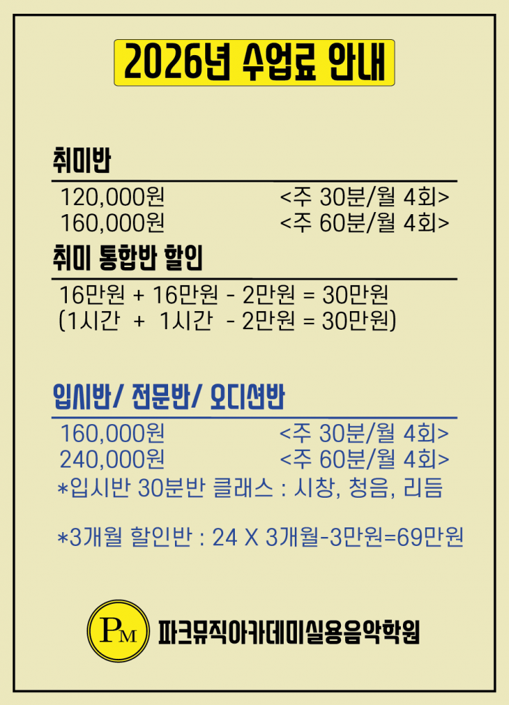 안녕하세요 파크뮤직아카데미 실용음악학원입니다.